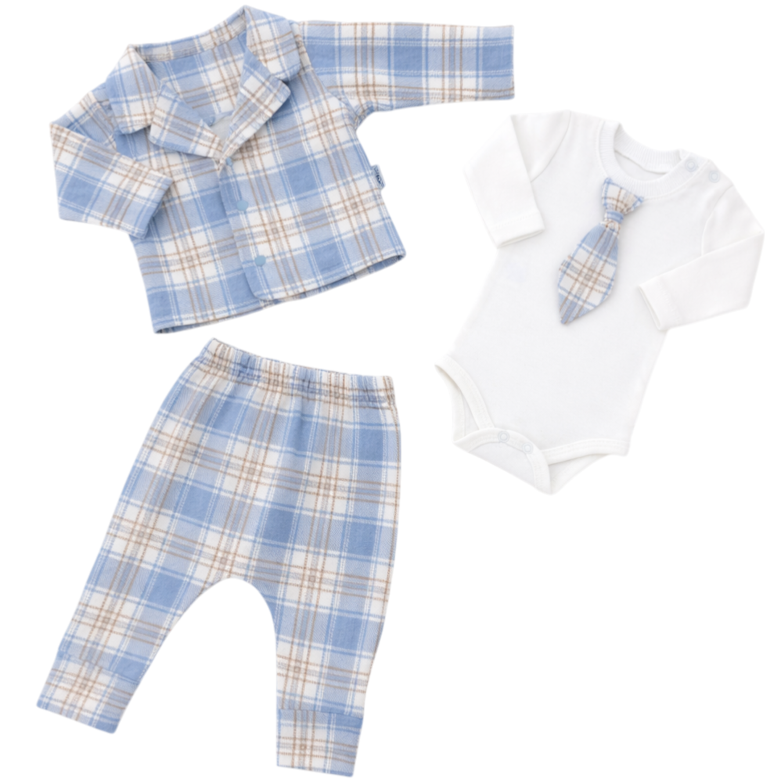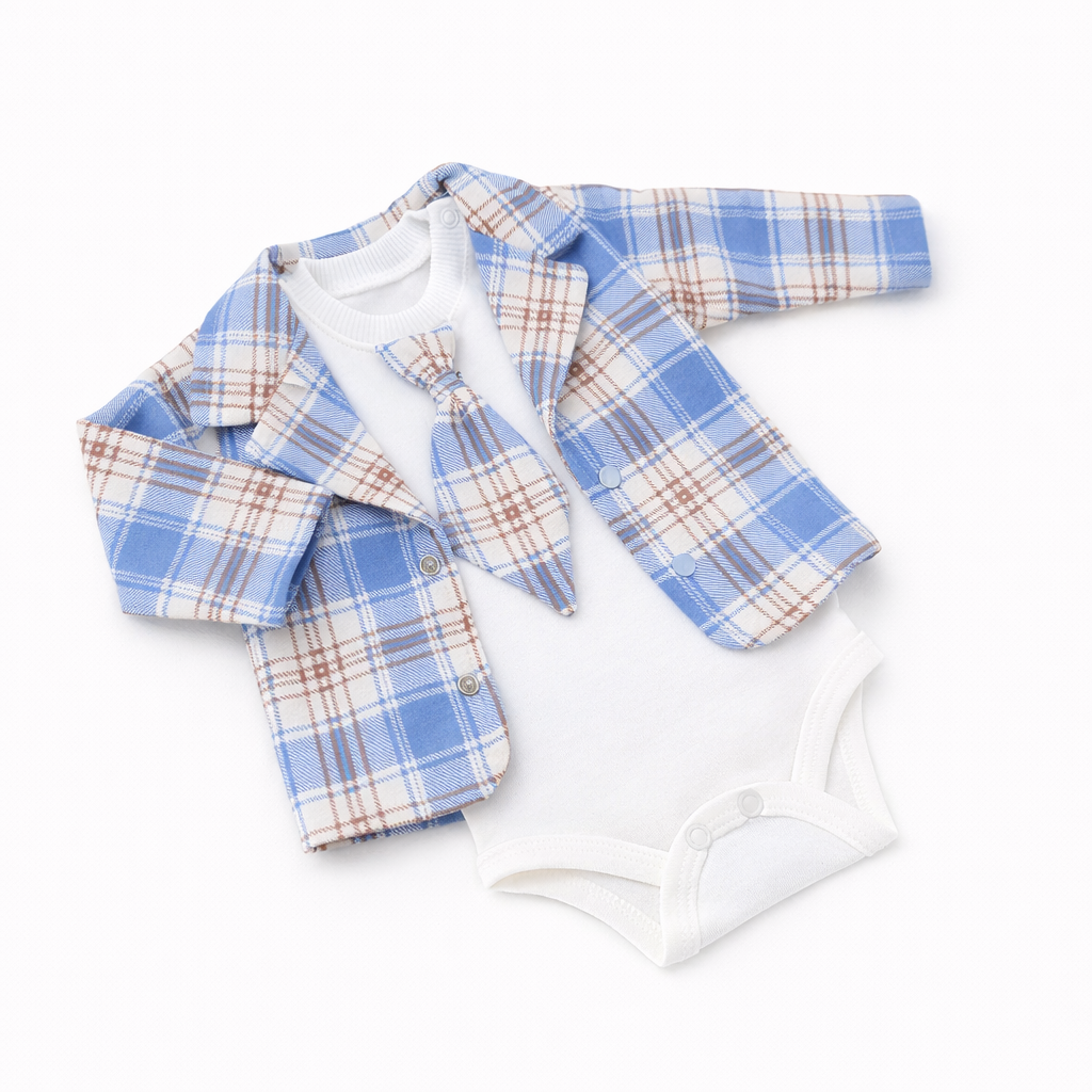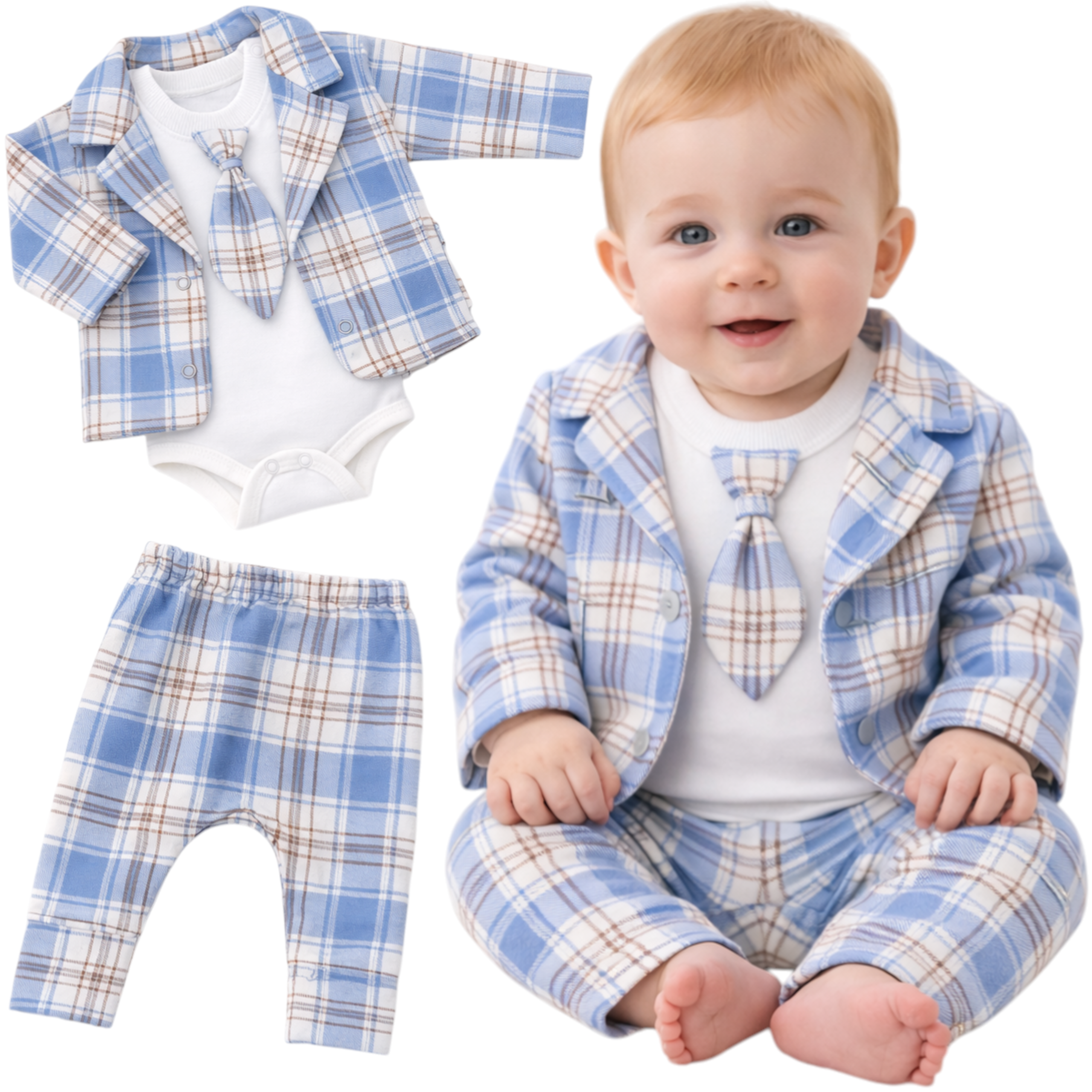Wyjątkowy, elegancki komplet niemowlęcy składający się z marynarki w modną niebieską kratę, body z krawatem oraz spodni w dopasowanym wzorze. Idealny wybór na uroczystości rodzinne, chrzest, wesele, święta czy sesję zdjęciową.