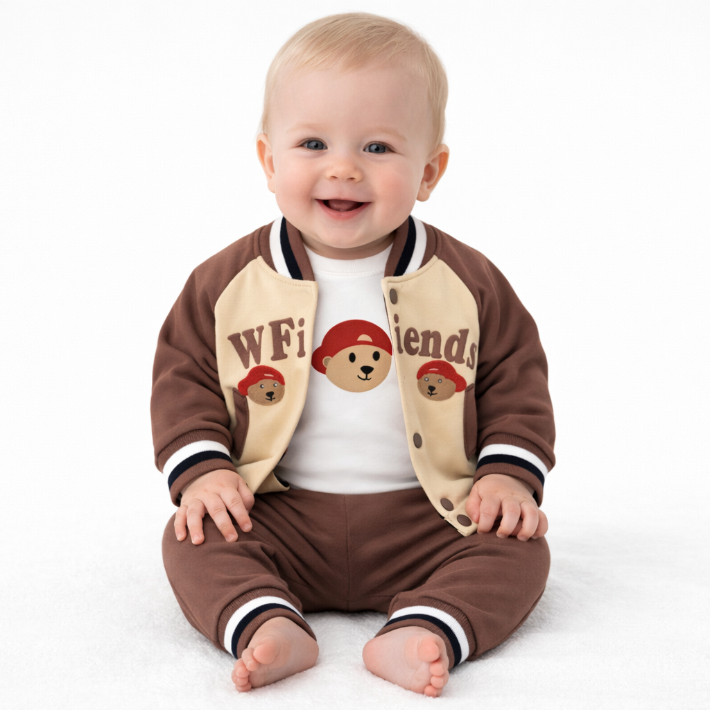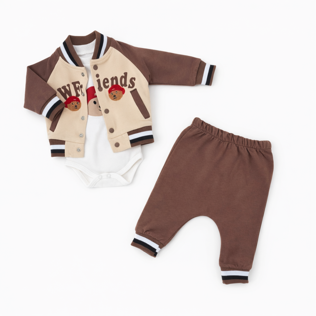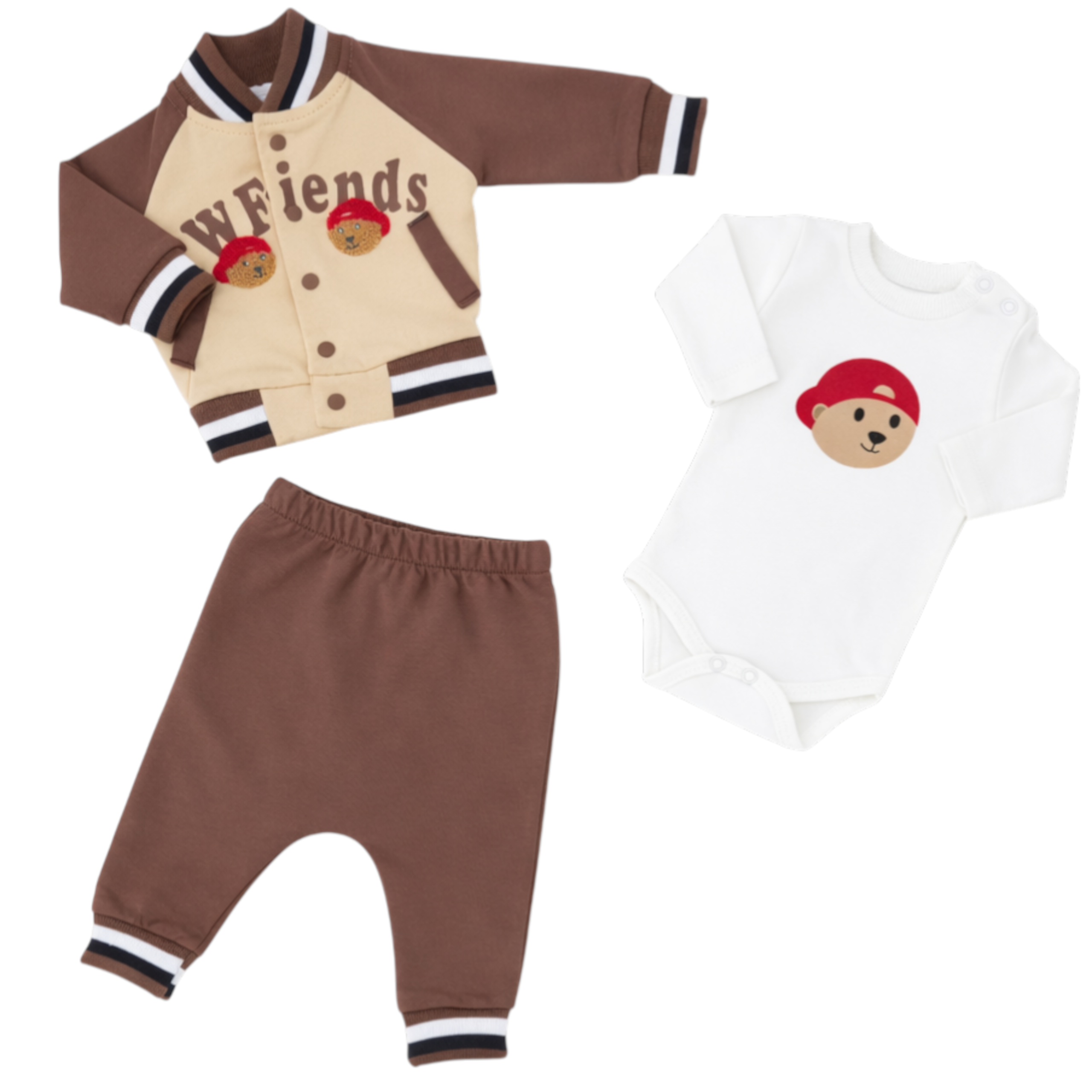 Modny i wygodny komplet niemowlęcy dla chłopca składający się z bluzy typu bejsbolówka, białego body z nadrukiem oraz brązowych spodni. Idealne połączenie stylu sportowego z komfortem dla maluszka.