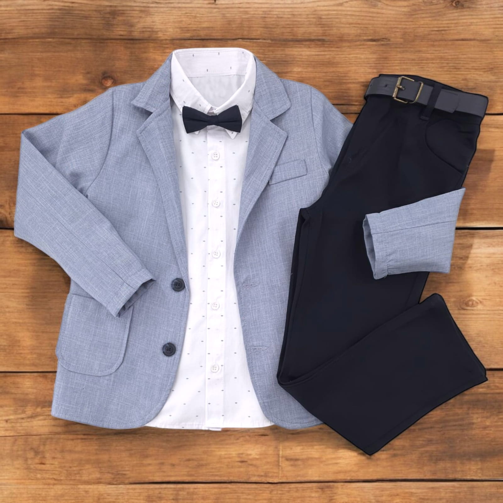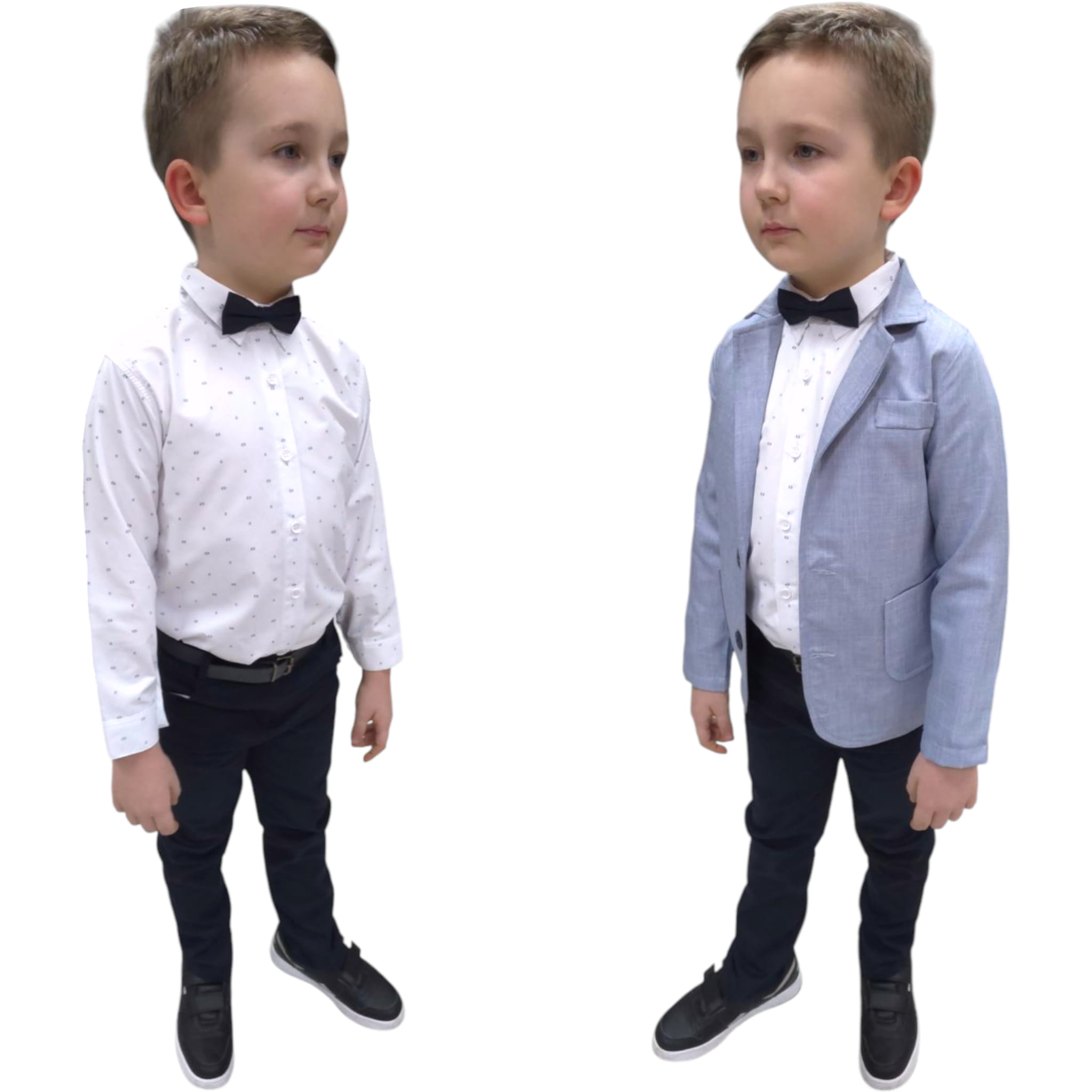 - Wygodny komplet na ważne wyjścia - składa się z marynarki, spodni, koszuli, paska i muszki.