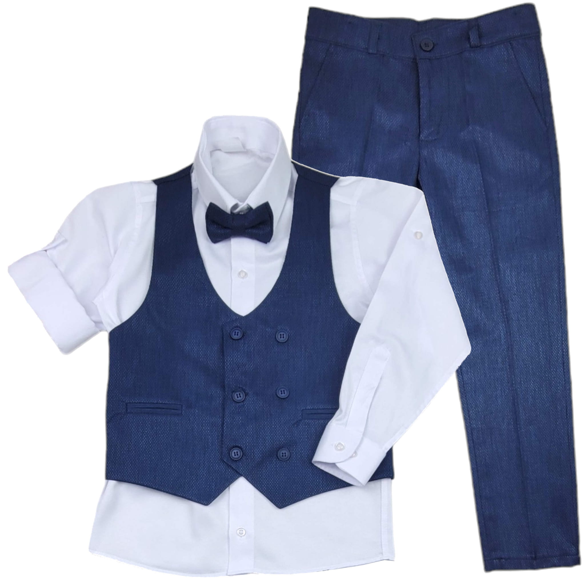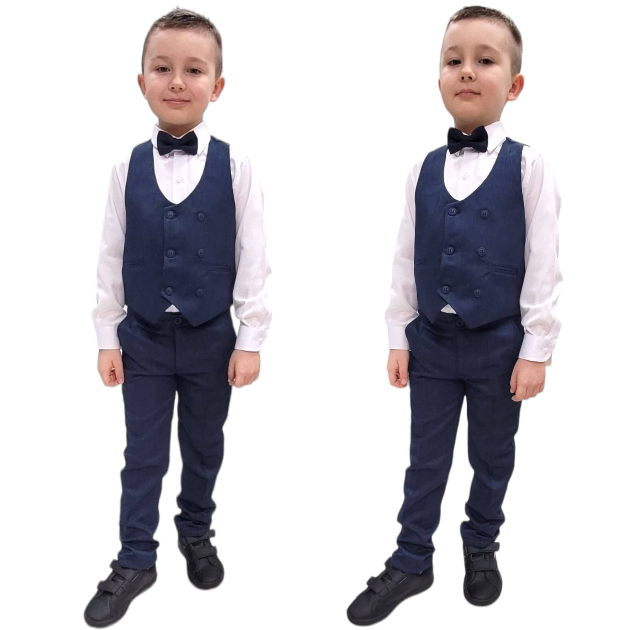 * Wygodny komplet na ważne wyjścia - składa się z kamizelki, spodni, koszuli i muszki