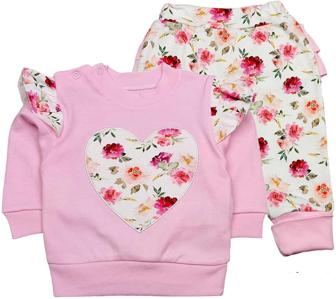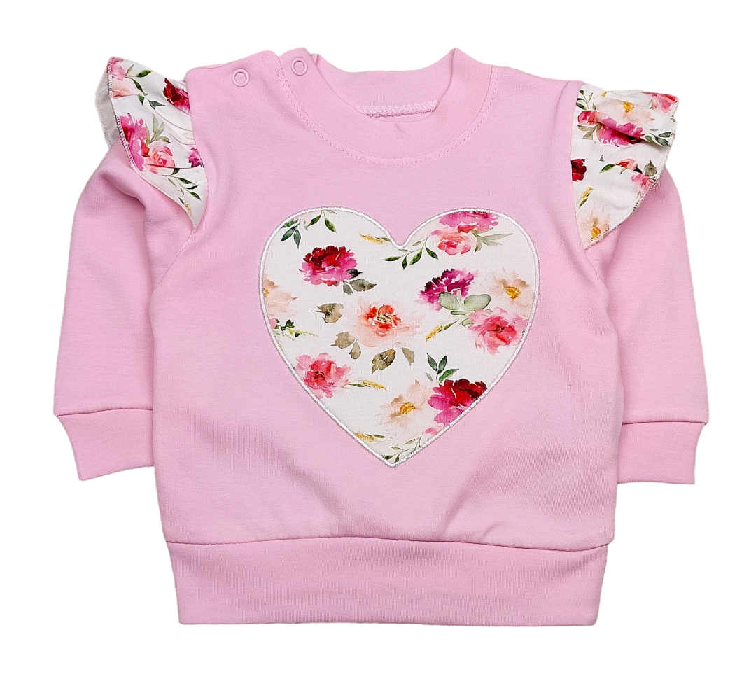 - bluza w kolorze różowym z ozdobnym sercem z kwiatowym nadrukiem, ramiona ozdobione delikatnymi falbankami