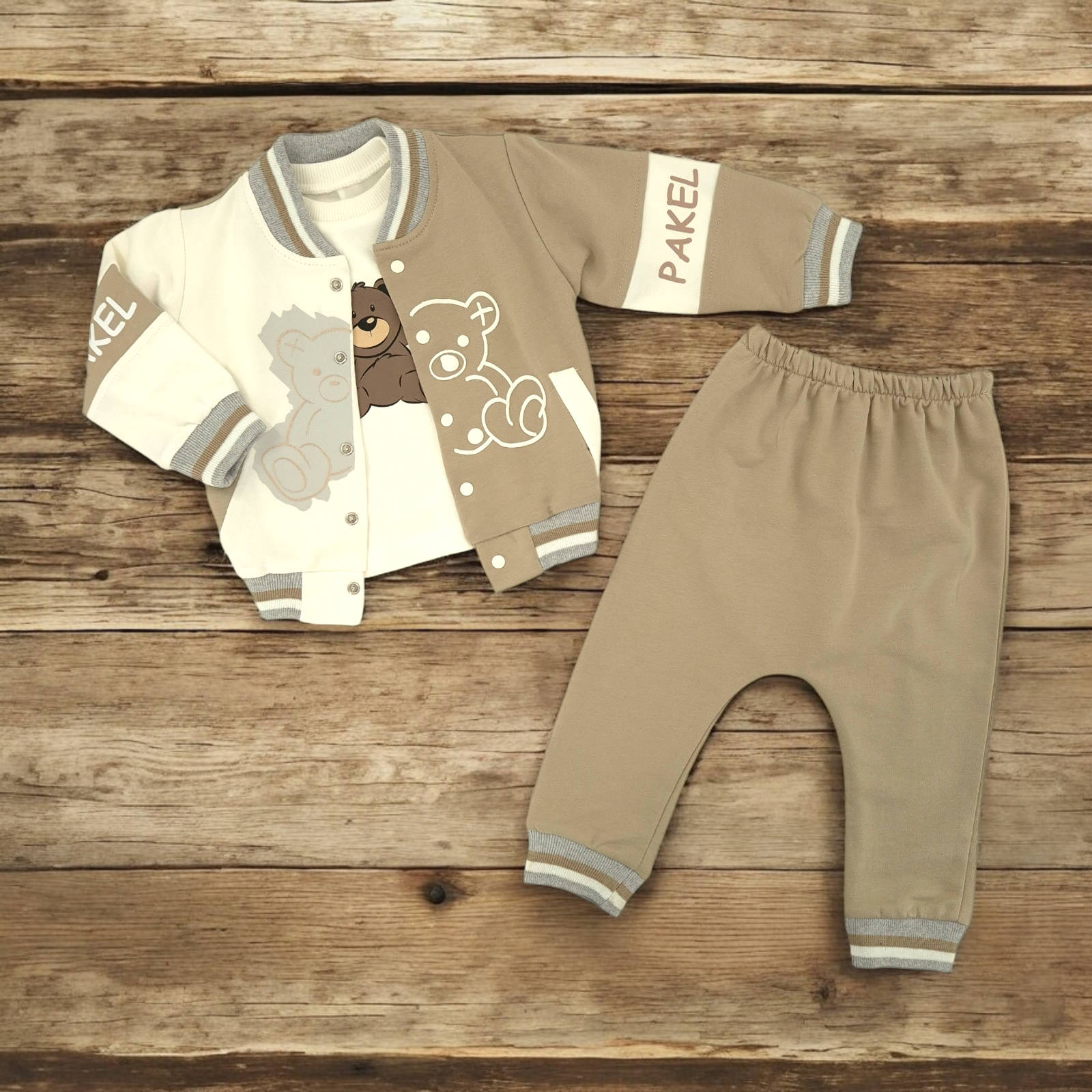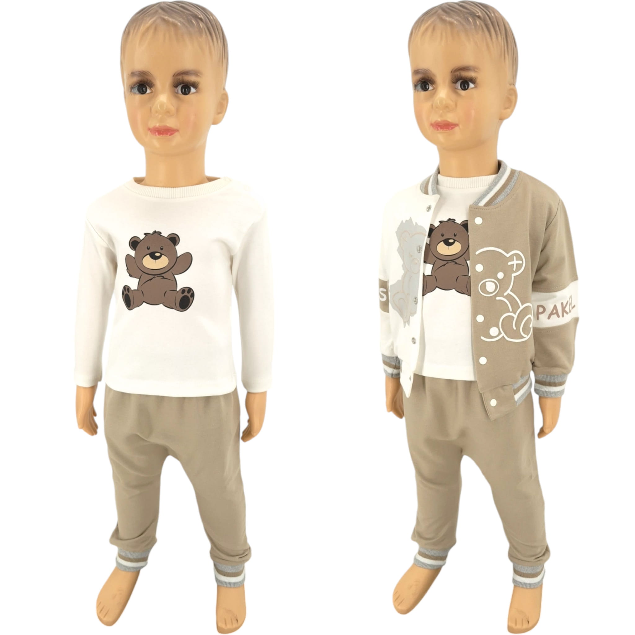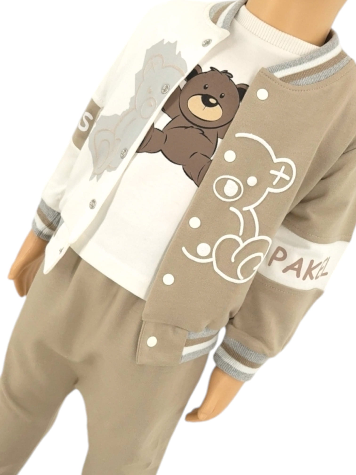 - Bluza Bomberka dopasowana do reszty kompletu, ma swobodny krój i jest zapinana na napy co ułatwia zakładanie i zdejmowanie. Na przodzie bluzy miś.