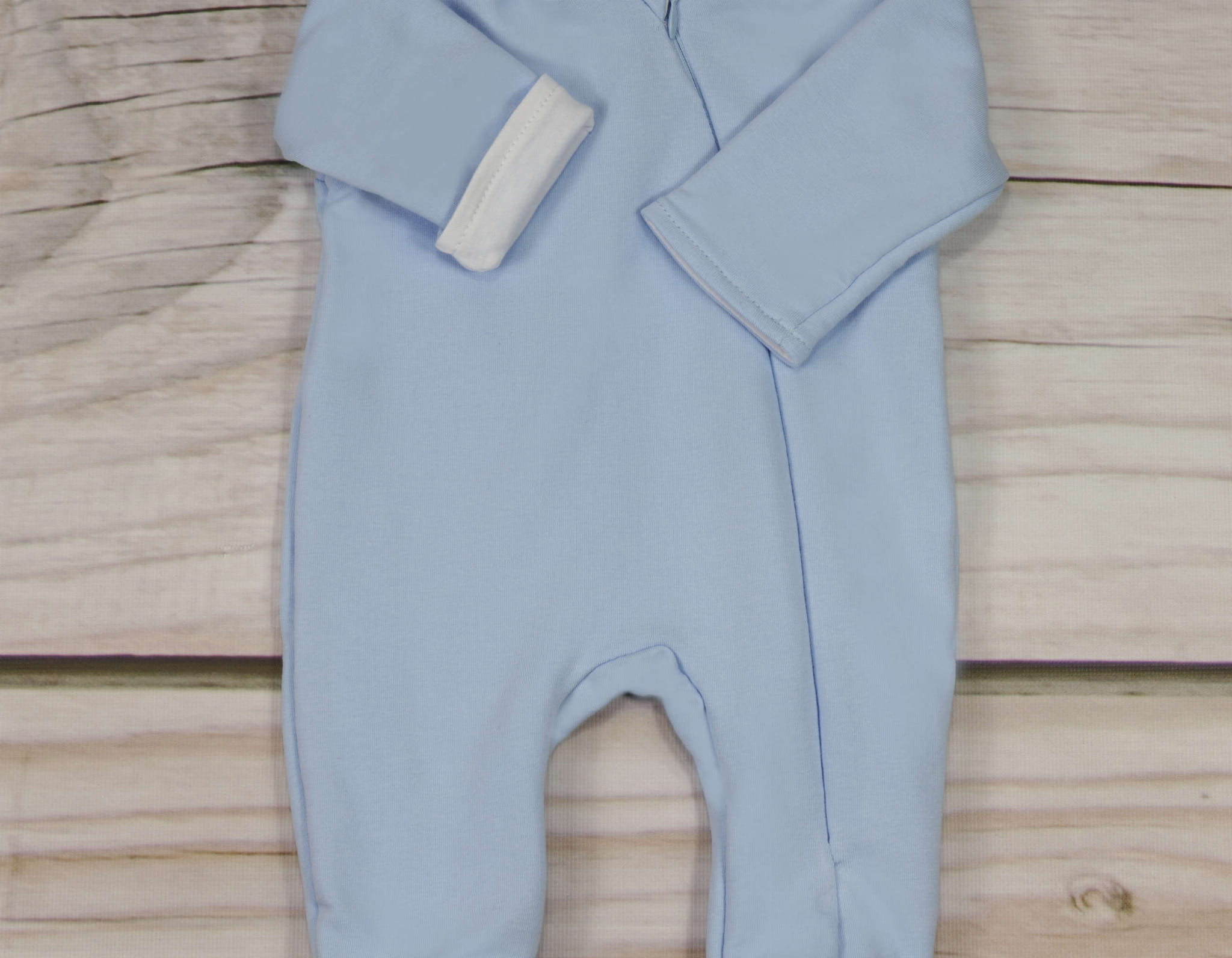 Kombinezon rozsuwa się aż do stopki co daje nam dużo miejsca i dzięki temu możemy bez stresowo ubrać dziecko. Pajac jest rozpinany zamkiem krytym przez co po zapięciu jest niewidoczny co daje efekt spójności. Zamek kończy się pod szyjką klapką zabezpieczającą maluszka przed bezpośrednim kontaktem.