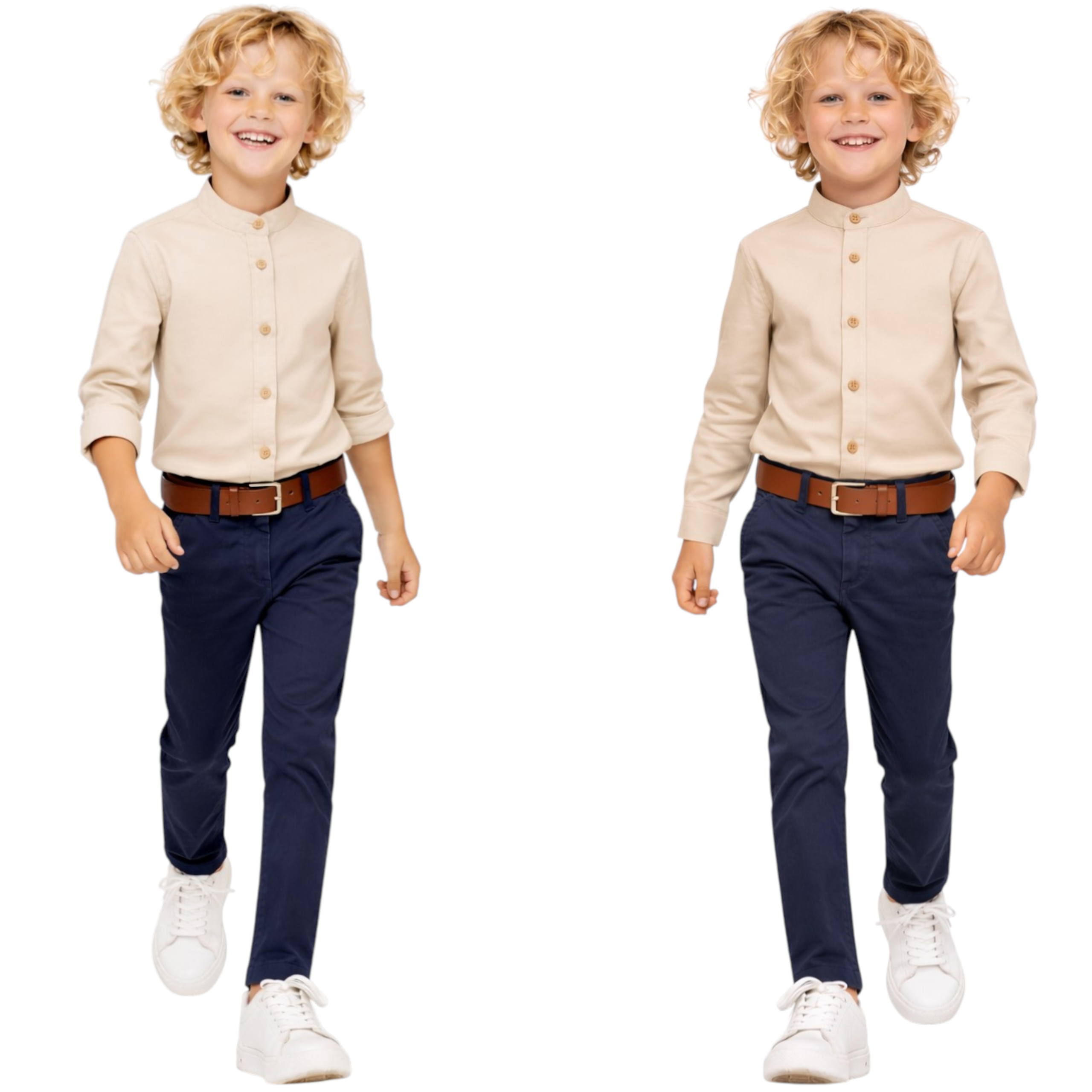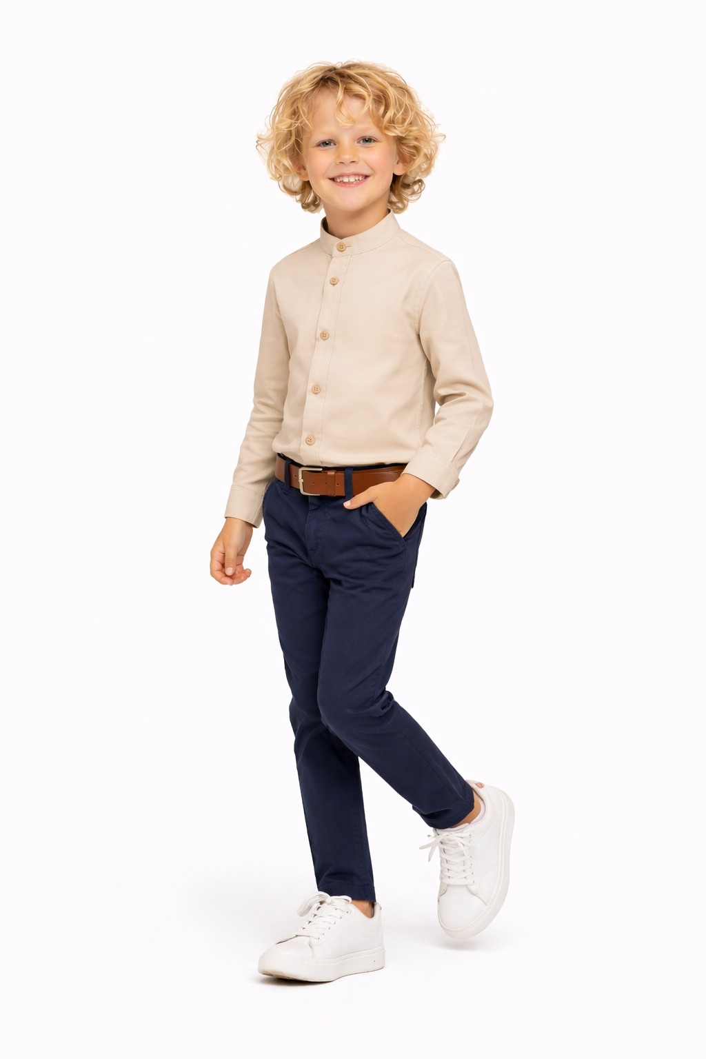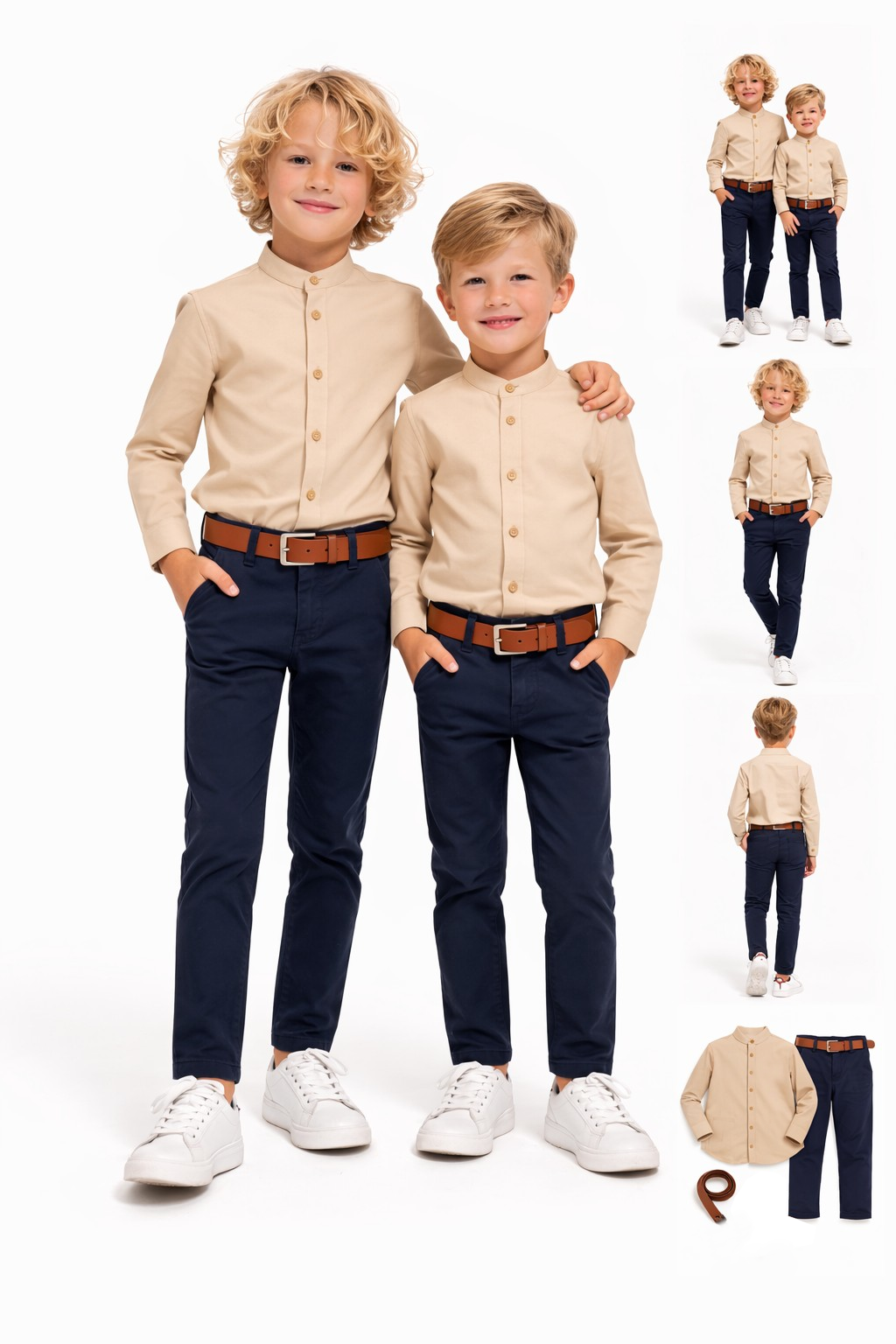 Stylowy komplet elegancki dla chłopca to doskonały wybór na ważne wydarzenia szkolne oraz uroczystości rodzinne. Zestaw składa się z koszuli ze stójką, eleganckich granatowych spodni oraz paska, dzięki czemu tworzy gotową, spójną stylizację wizytową.