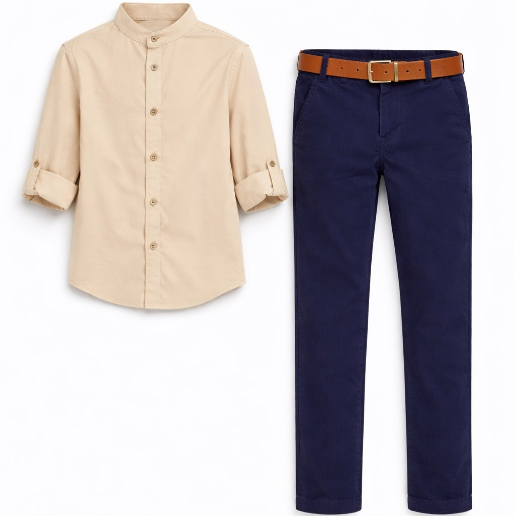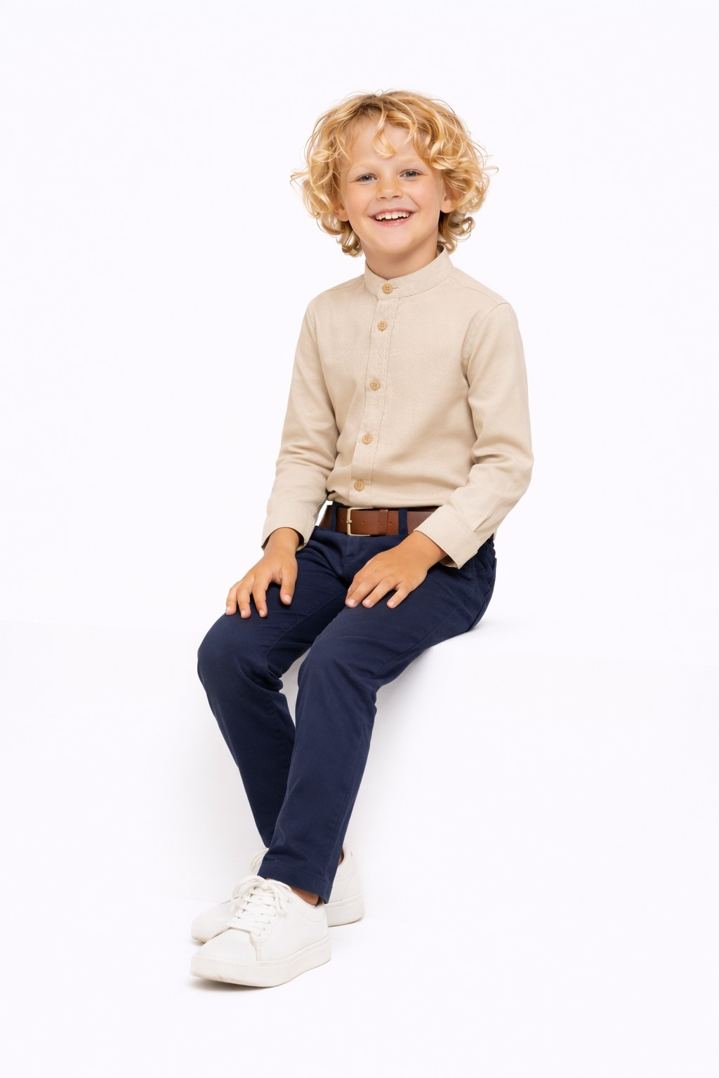 Elegancki komplet galowy dla chłopca – koszula ze stójką i granatowe spodnie
