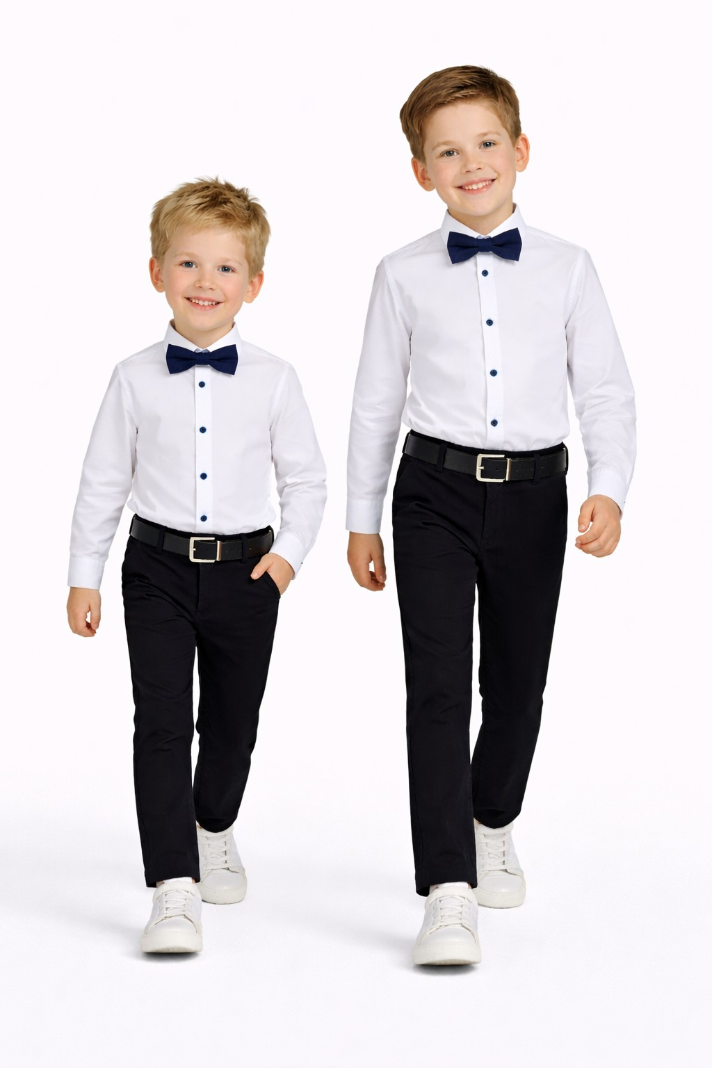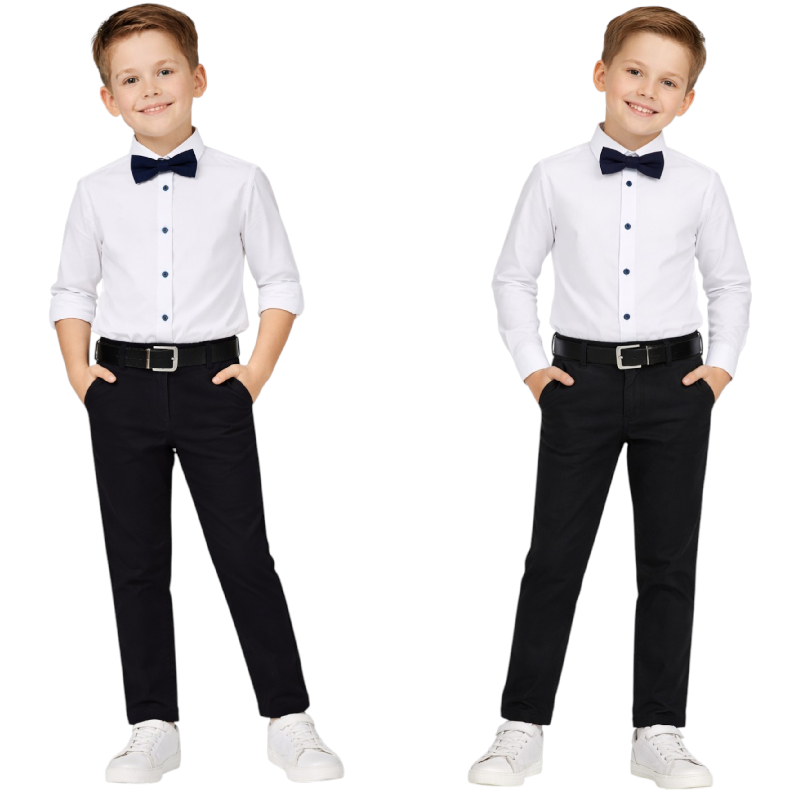 Elegancki komplet galowy dla chłopca to idealny wybór na szkolne uroczystości oraz rodzinne wydarzenia. Zestaw składa się z białej koszuli, eleganckich czarnych spodni, muchy oraz paska, dzięki czemu tworzy gotową stylizację wizytową.