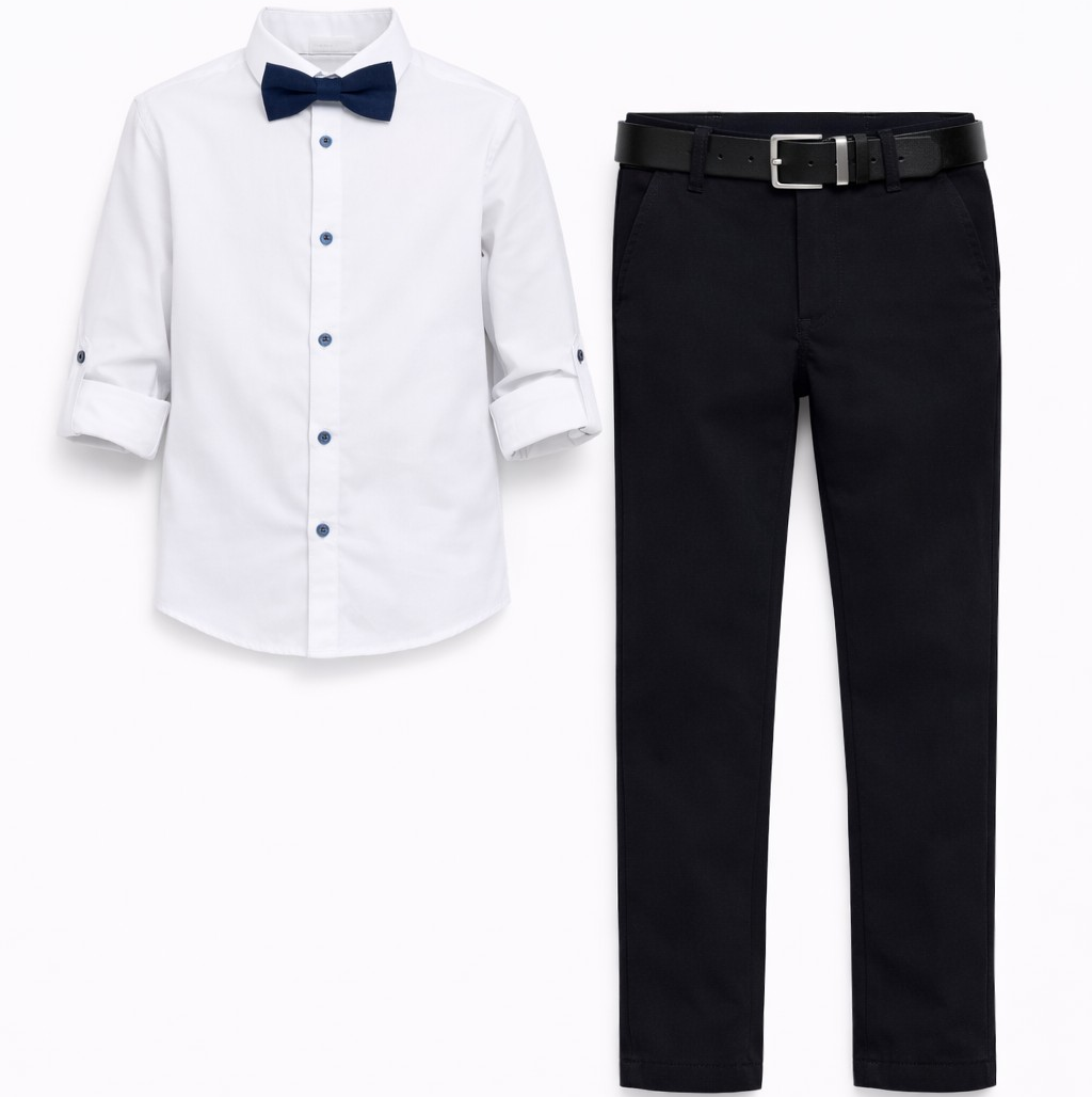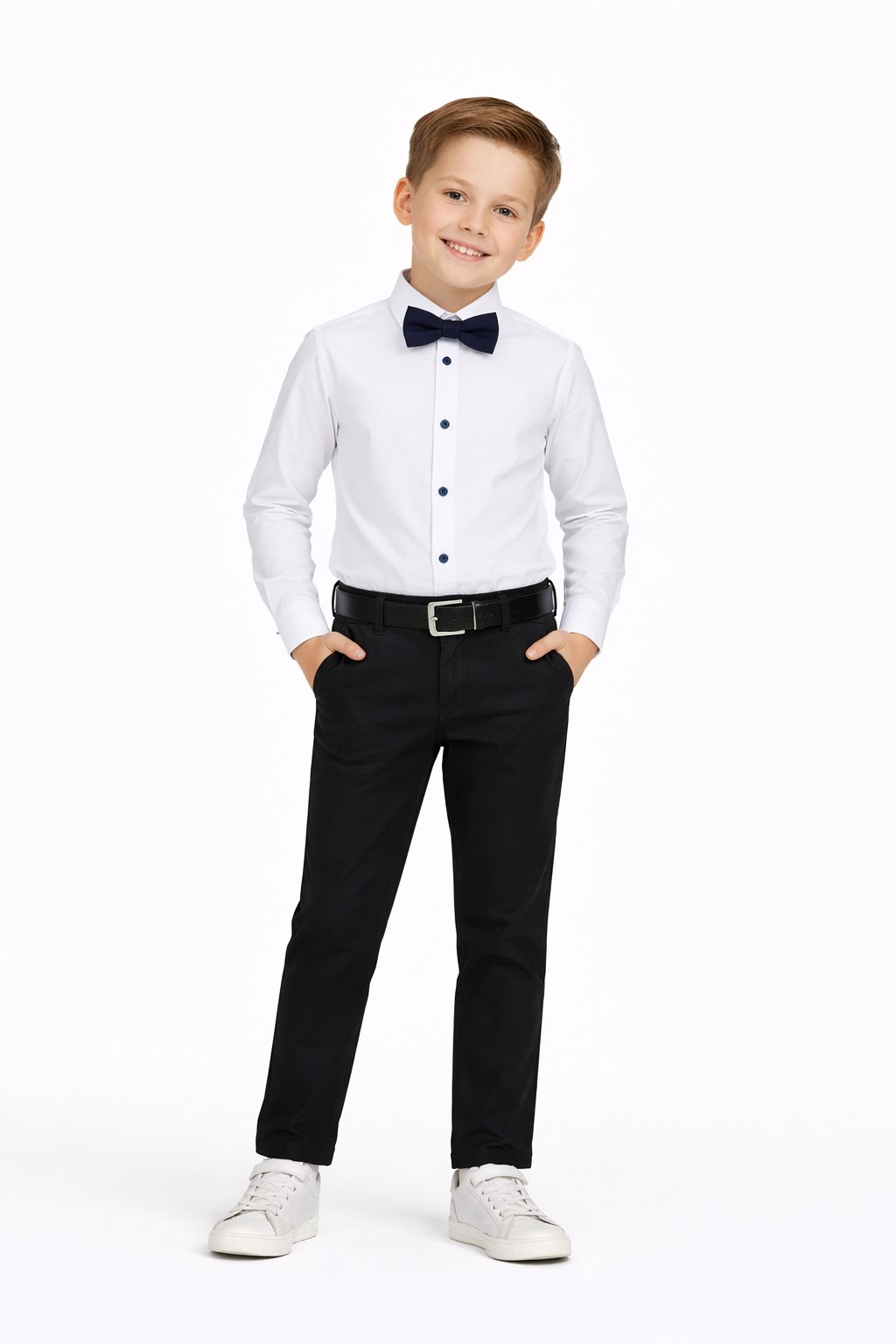 Komplet biała koszula z granatową muchą plus czarne spodnie z paskiem 104/164 cm
