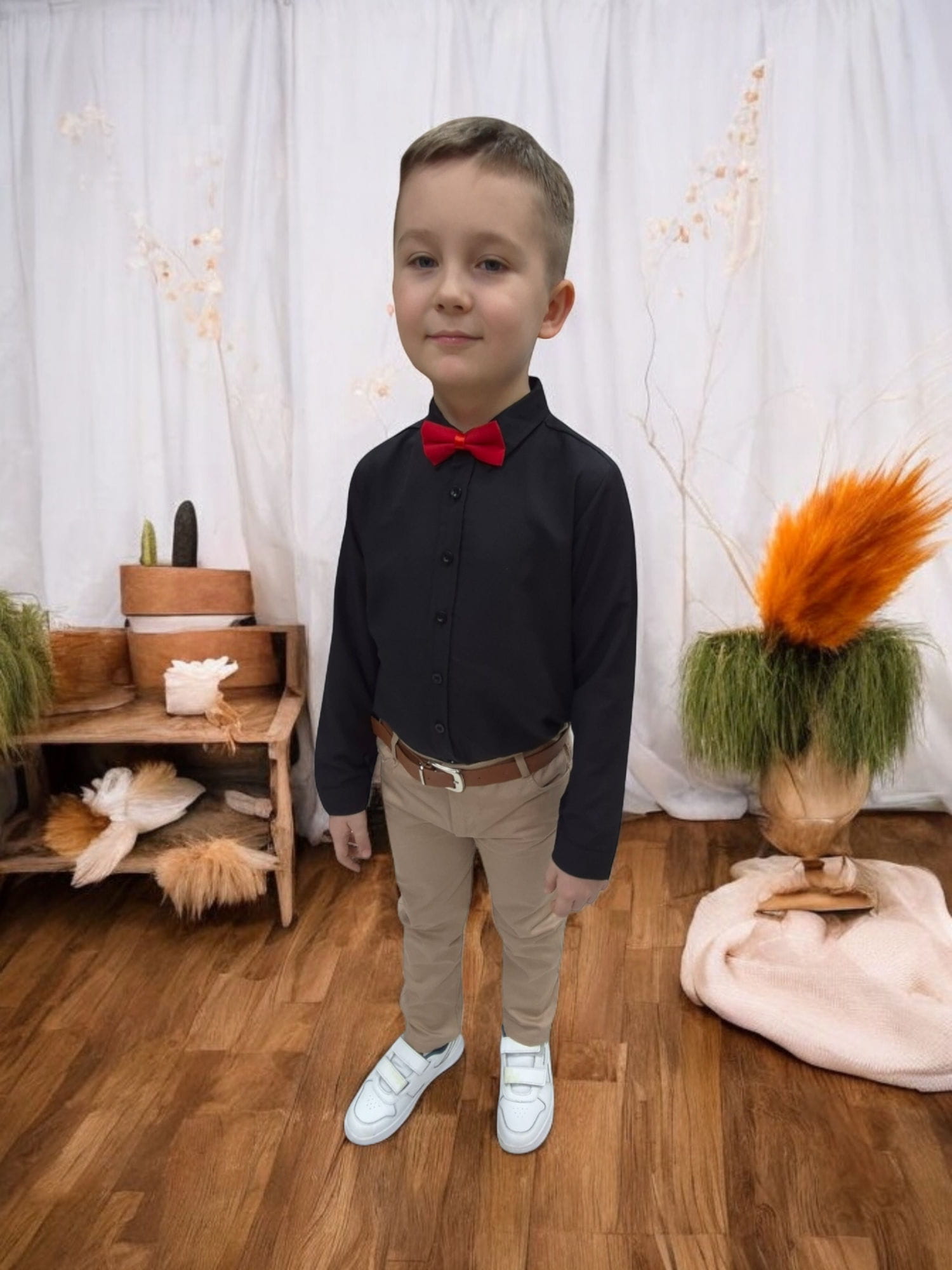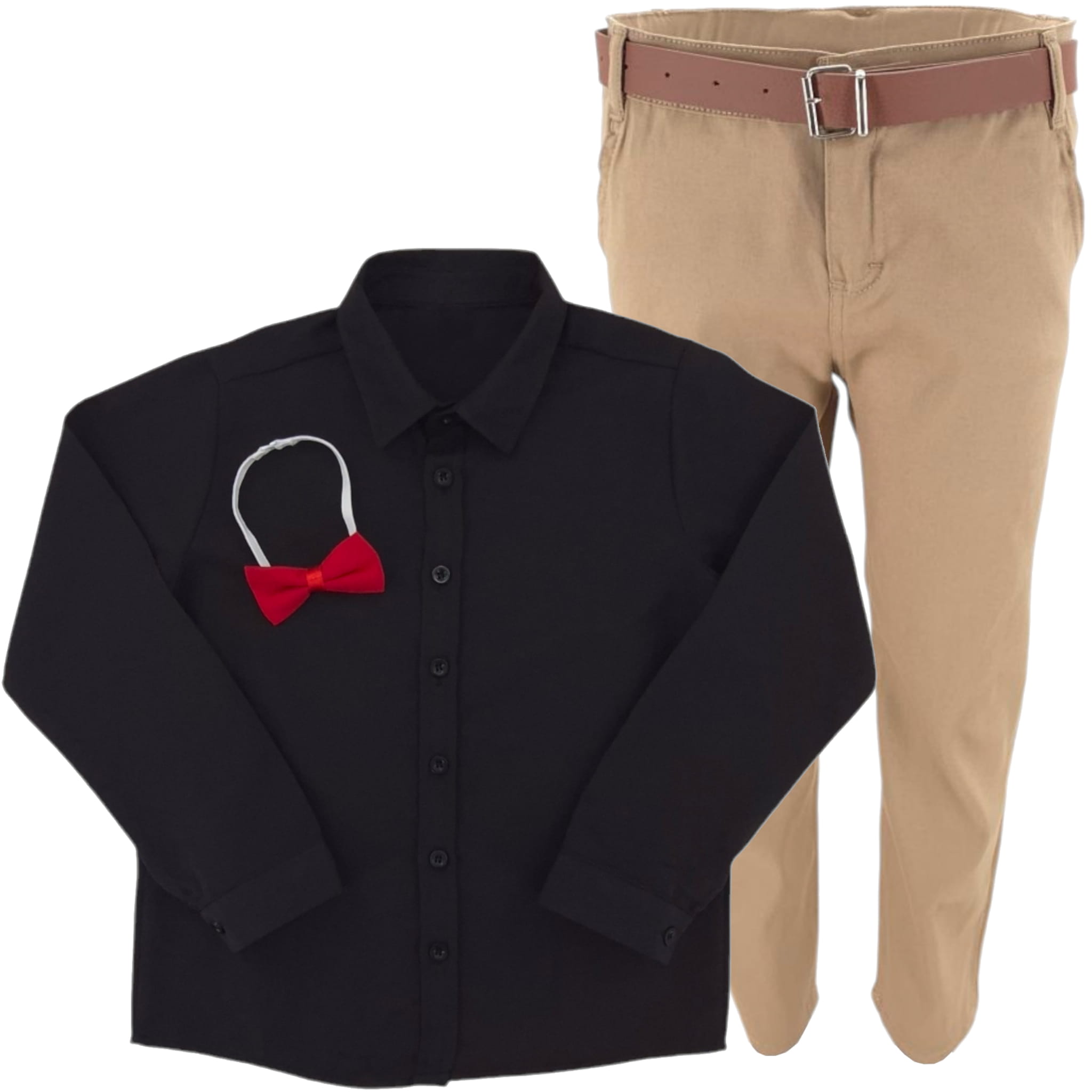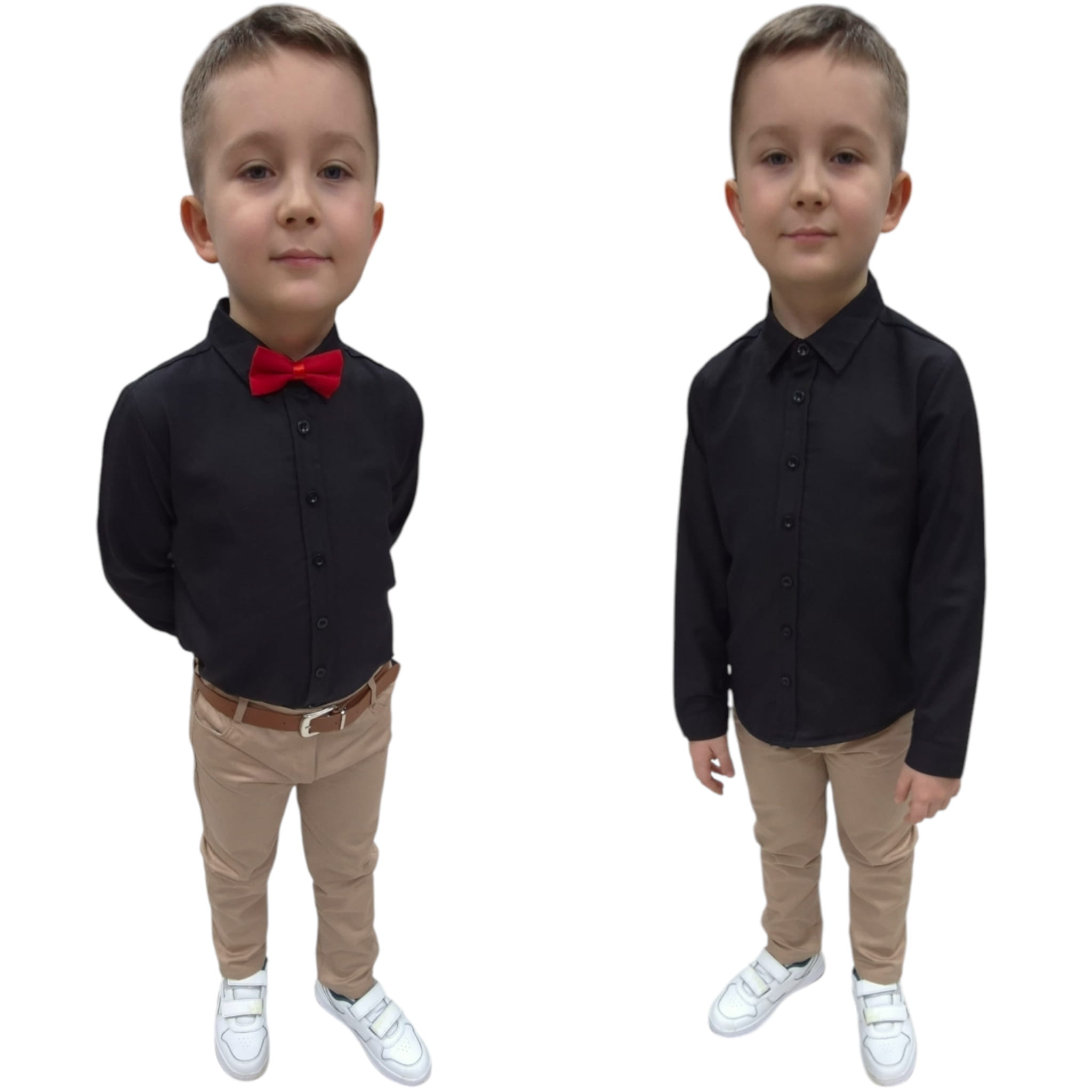 Komplet czarna koszula z muchą plus beżowe spodnie z paskiem 104/164 cm