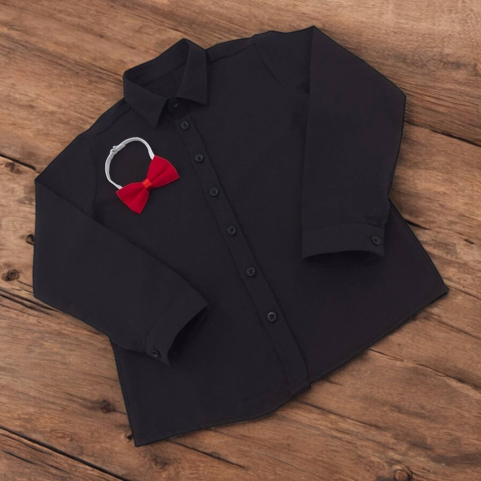 Elegancka czarna koszula dla chłopca z kołnierzykiem pod szyją, idealna na specjalne okazje. Koszula z długim rękawem, dodaje szyku każdej stylizacji.
