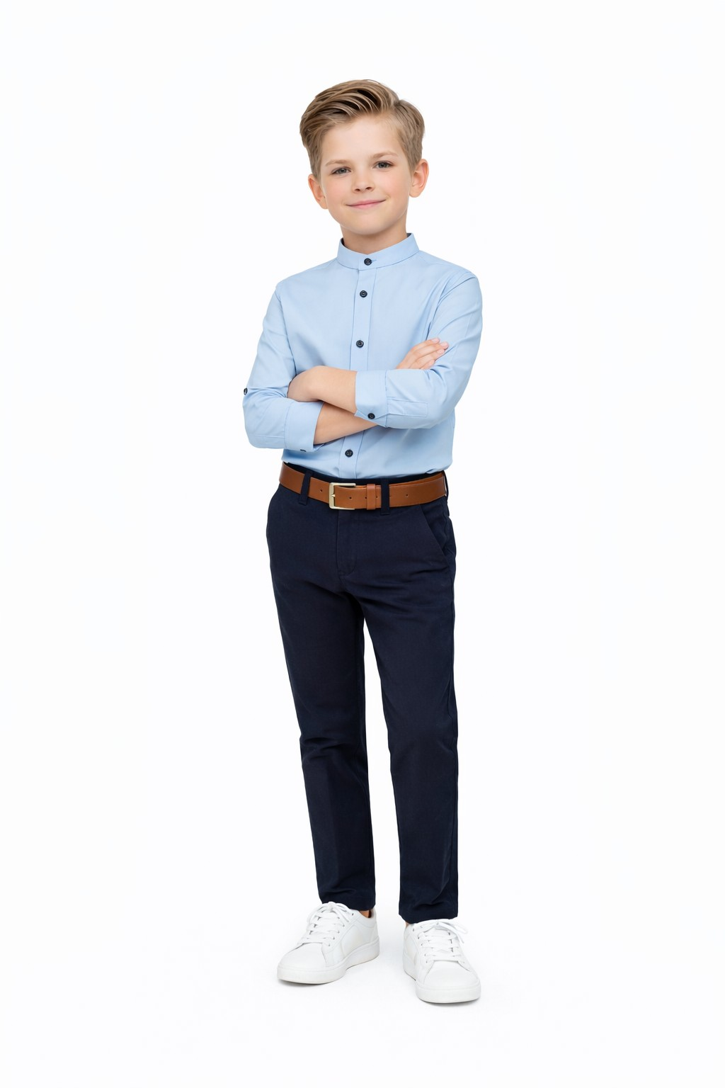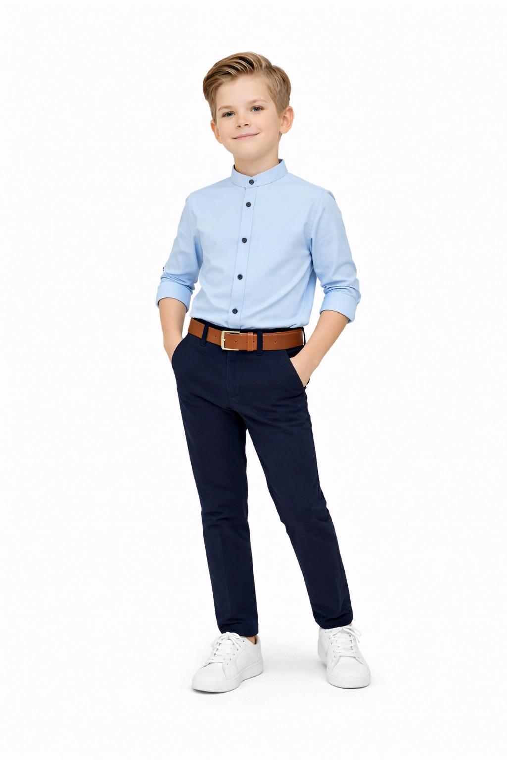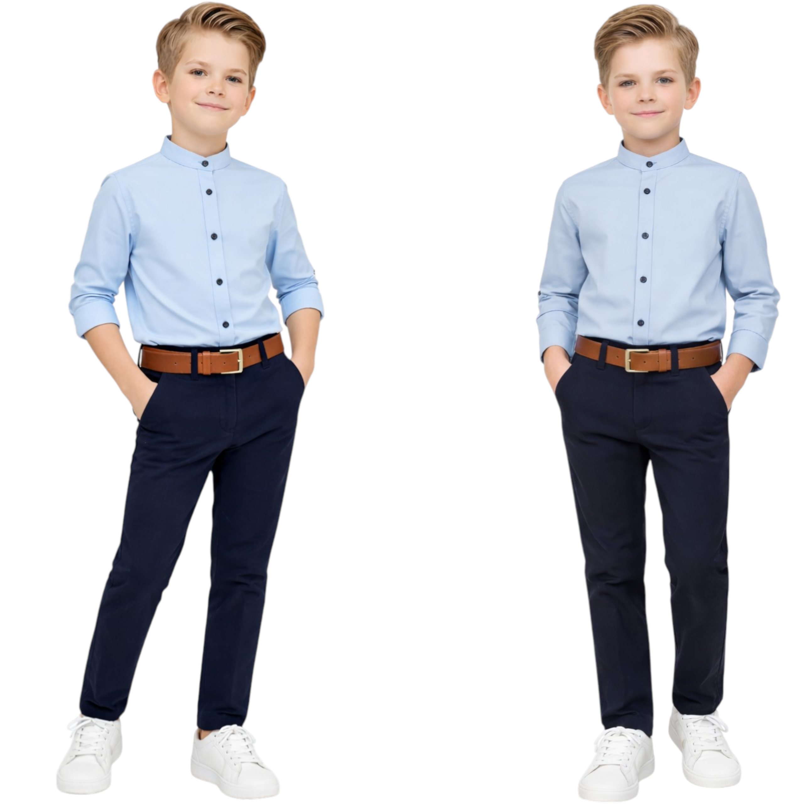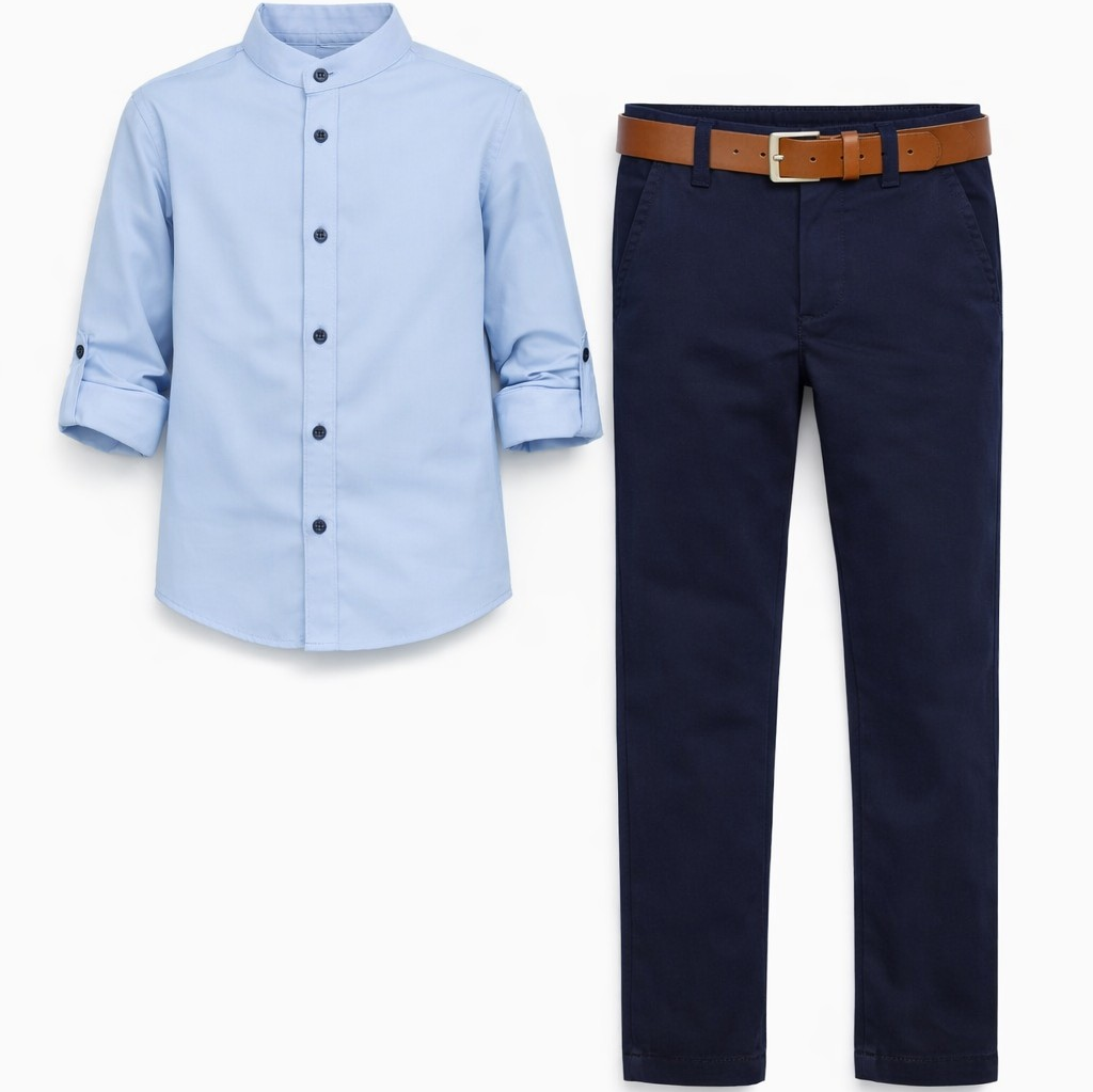 Stylowy komplet elegancki dla chłopca to doskonały wybór na ważne wydarzenia szkolne oraz uroczystości rodzinne. Zestaw składa się z eleganckiej koszuli ze stójką, granatowych spodni oraz paska, dzięki czemu tworzy gotową i bardzo stylową stylizację wizytową.