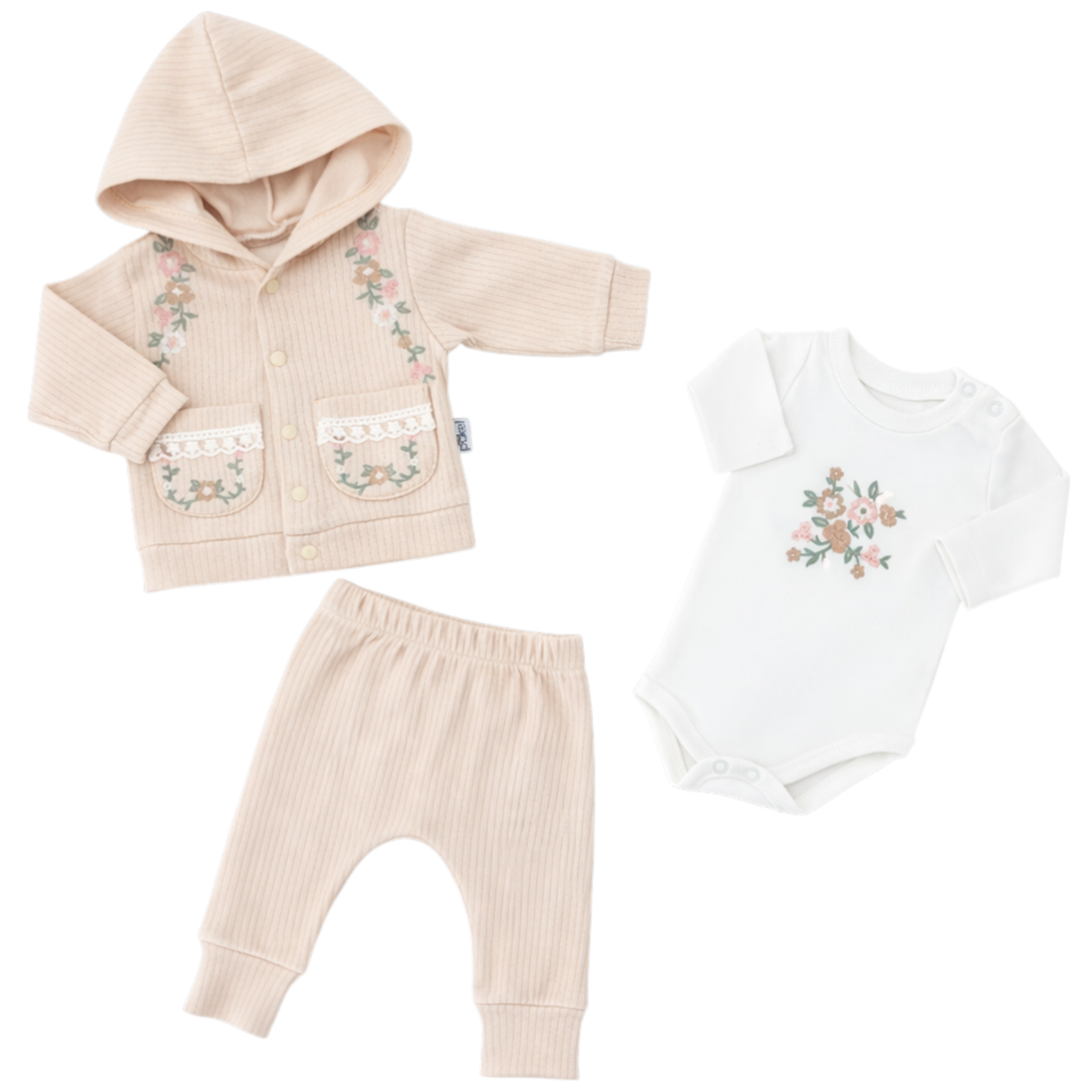 Komplet niemowlęcy 3-częściowy dla dziewczynki – beżowy w kwiatki