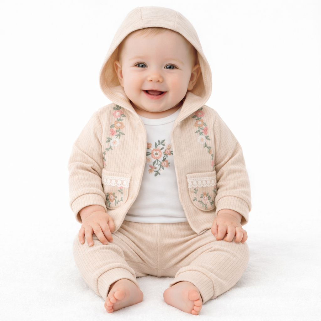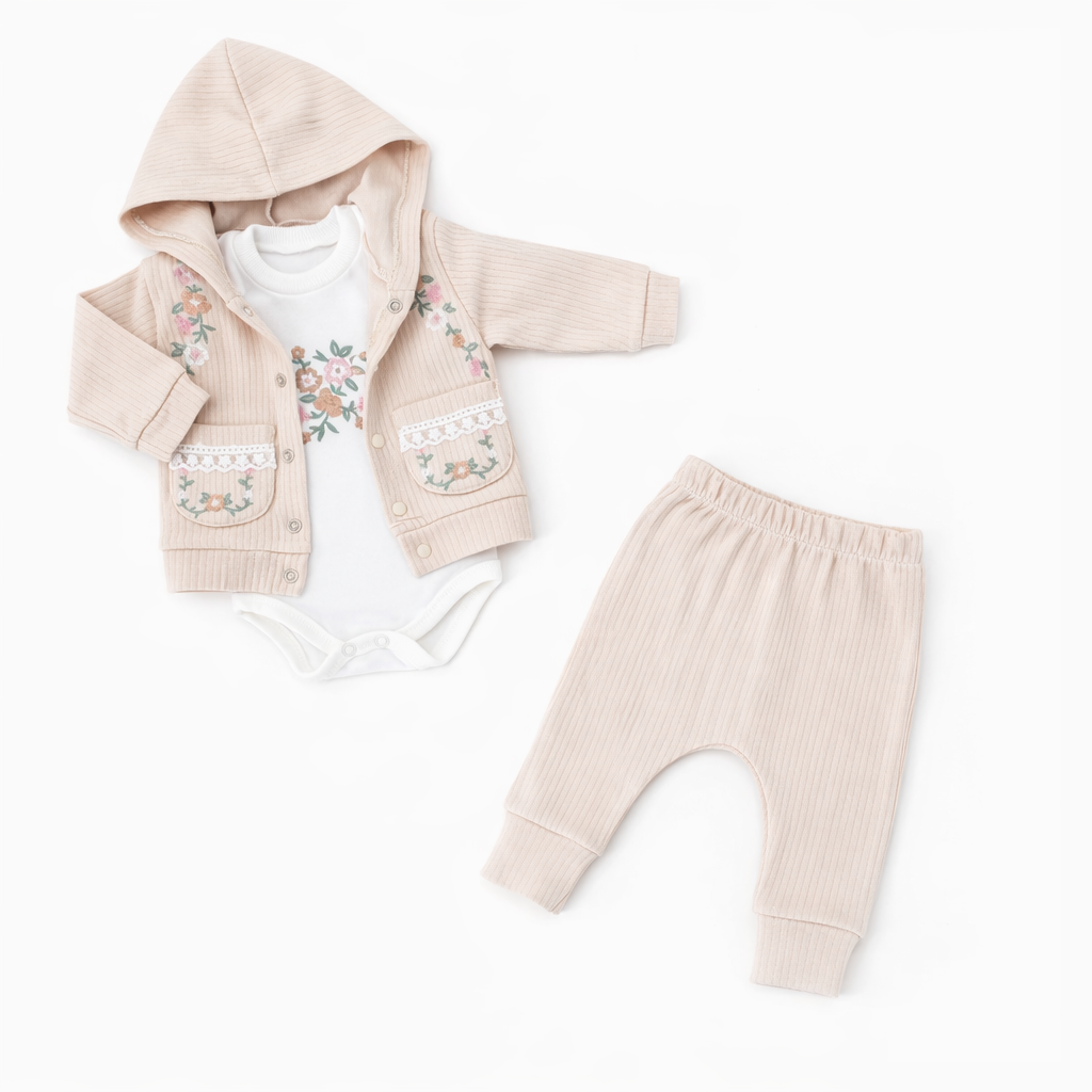 Uroczy, delikatny i niezwykle wygodny komplet niemowlęcy dla dziewczynki składający się z bluzy z kapturem, białego body oraz beżowych spodni. Idealny zestaw na co dzień, na spacer, wizytę u rodziny czy jako prezent dla maluszka.