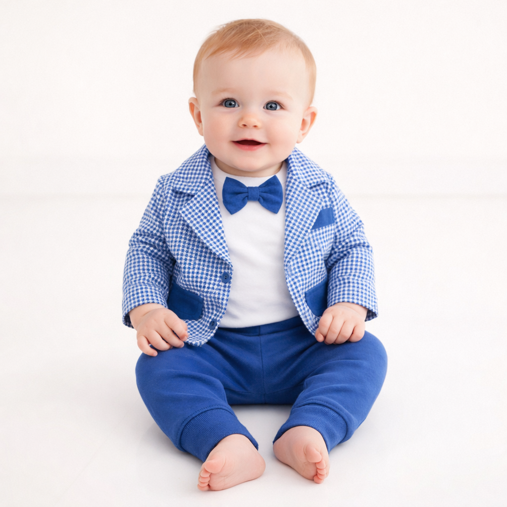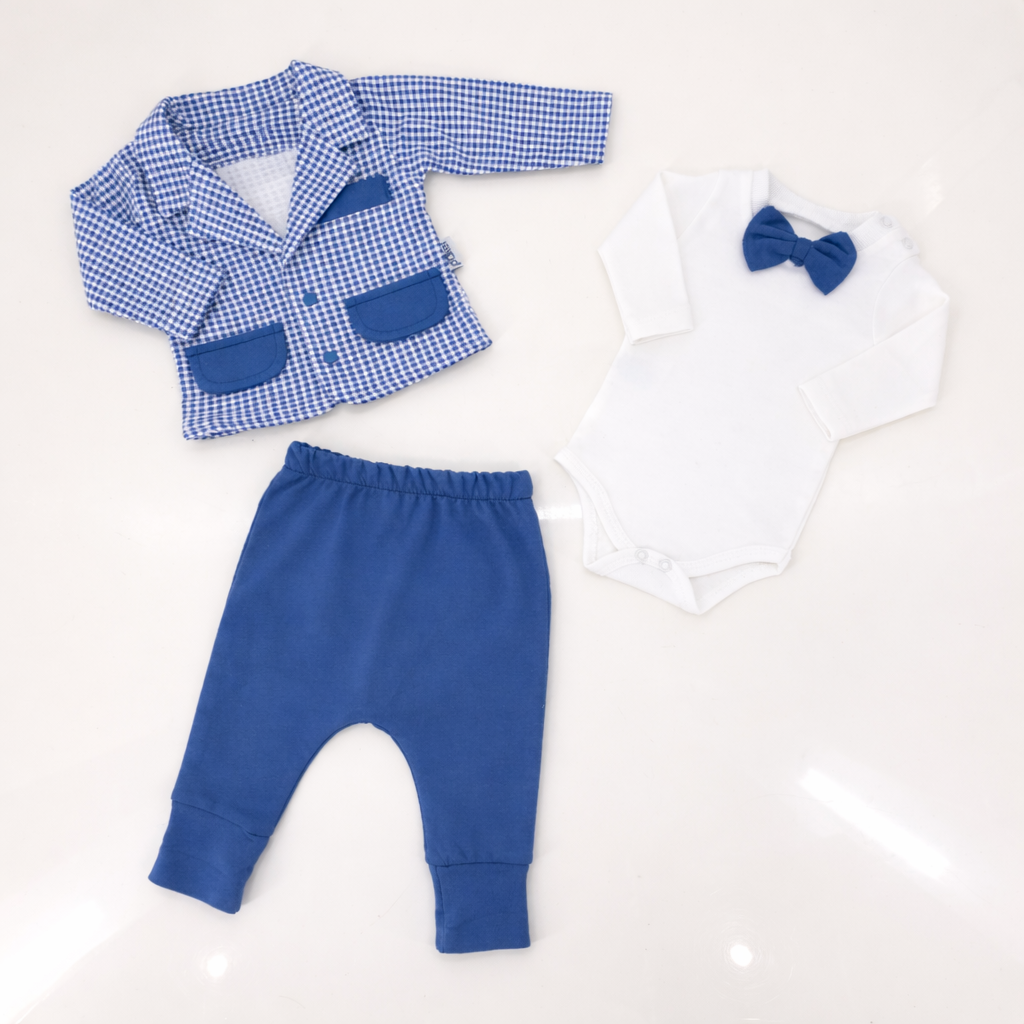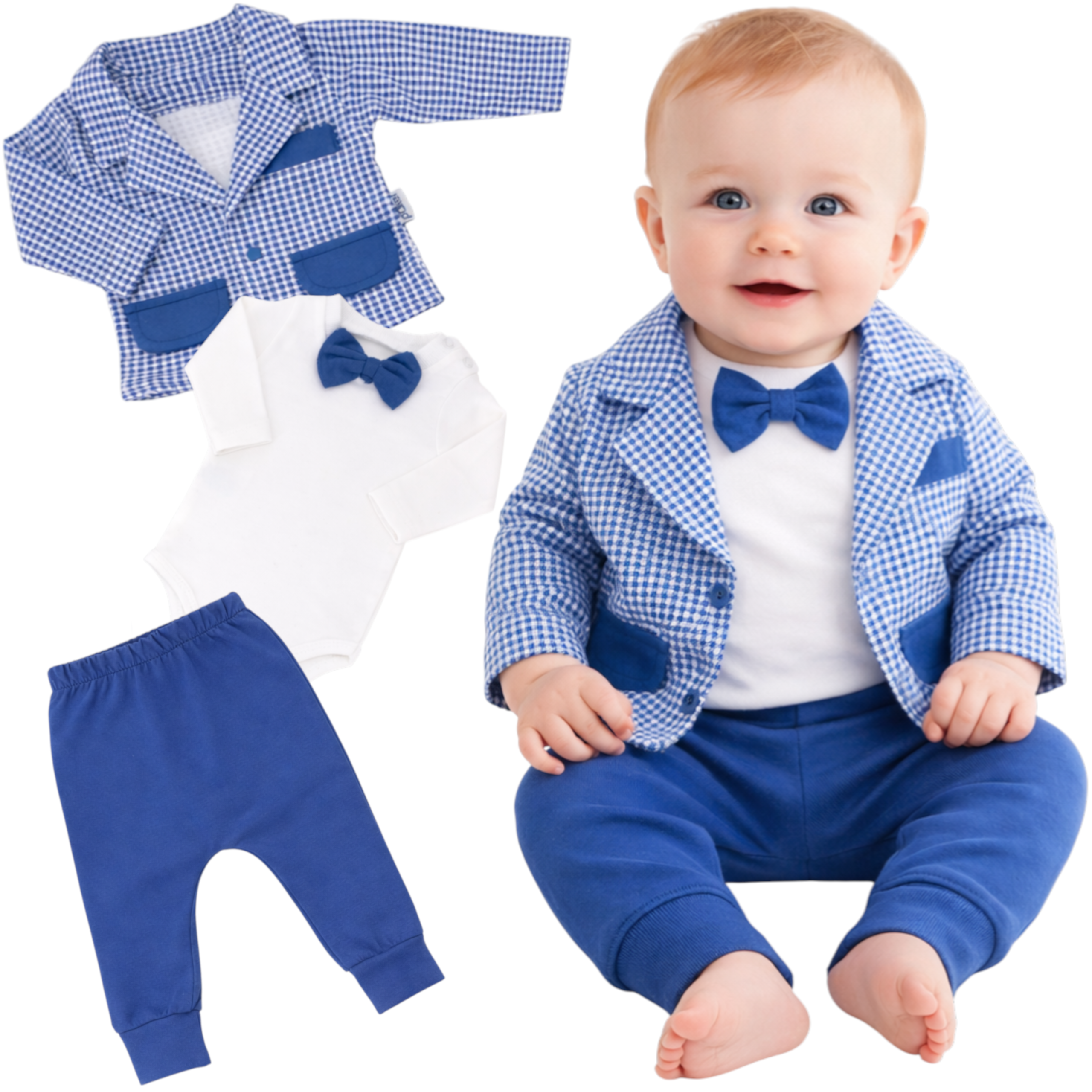 Wyjątkowy, elegancki komplet niemowlęcy składający się z marynarki w niebieską kratę, body z muchą oraz granatowych spodni. Idealny wybór na uroczystości rodzinne, chrzest, wesele, święta czy sesję zdjęciową.